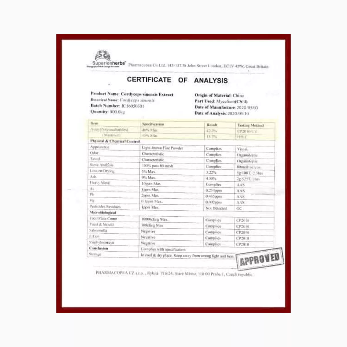 Ne všechny druhy mycelia Cordycepsu mají stejné vlastnosti. Na kvalitě použitého mycelia závisí účinnost výsledného produktu. Superionherbs používá mycelium Cordycepsu nejvyšší kvality pro optimální účinek výsledného produktu.