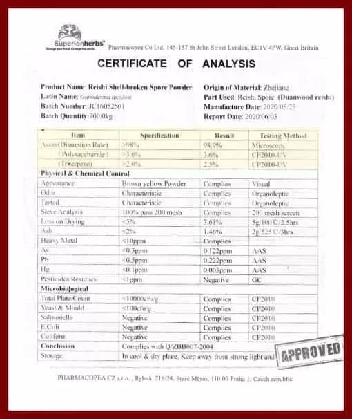 Spórový prášek je esencí houby (spóry slouží k rozmonožování Reishi) a z 1000 kg hub se získá 1-2 kg sporového prášku. Ten se speciální metodou za studena musí dezintegrovat, aby účinné látky byly využitelné pro lidský organizmus. Stupeň dezintegrace (shell broken rate) určuje kvalitu produktu. V produktech Superionherbs používáme spórový prášek s 97% dezintegrací.