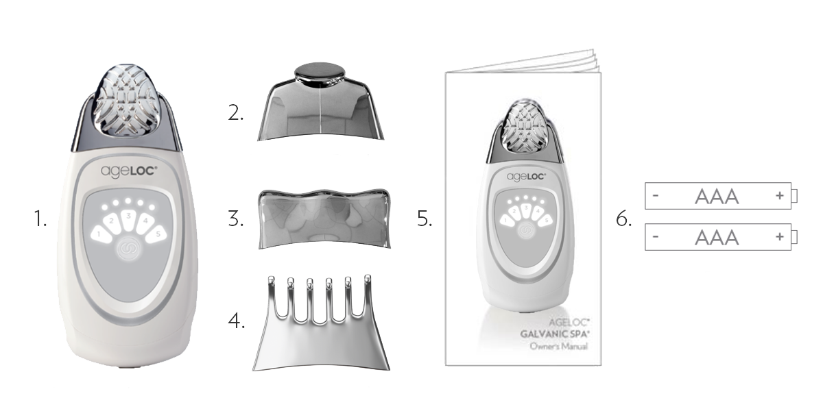 Přístroj ageLOC Galvanic Spa obsahuje značkový, patentovaný nástroj se čtyřmi vyměnitelnými nástavci. Nástavce jsou vyrobeny z ABS - akrylonitril-butadien-styrenu - s galvanicky pochromovaným povrchem. Po použití otřete vlhkým hadříkem a osušte suchým.